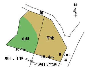物件No.1227 吉海町名 売土地220万円 最適用途:住宅用地 土地:宅地79坪(262.37u)、山林79坪(263u) 交通:亀山バス停から約300m 都市計画:都市計画区域外 環境:住宅地域 地勢:ひな壇 道路:(東)4.3m、(北)1.8m 水道:道路に水道本管あり 汚水:道路に公共用下水配管あり 雨水:側溝へ放流 取引態様:仲介 26-2-18 3492-1、3493-1