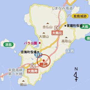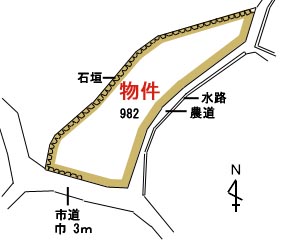 物件No.1494 吉海町名982 売土地 151万円 最適用途:住宅用地 土地:宅地500.41u(151坪) 交通:山ノ鼻バス停まで約600m 用途地域:都市計画区域外の無指定地域 環境:住宅地域 地勢:ひな壇 接道状況:(南)市3m 給水:道路に上水道本管有 排水:道路に公共用下水本管有 電気:中国電力 現況:更地 取引態様:仲介 6.5.15 物件は国道から山里に250m程入った先の傾斜道路を少し上がった所に位置し、日当り良好・閑静な環境の中に有ります。 大島南IC迄まで1.75km、スーパーマーケット(ライフショップ)まで約1.3kmの距離で、生活には比較的便利な場所です。