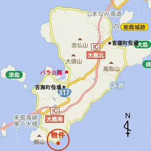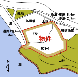 物件No.1513 吉海町名駒572、573-1 売土地 1,000万円 最適用途:保養施設用地 土地:山林3,594u(1,087坪) 交通:下田水港バス停まで約3.3km 用途地域:都市計画区域外の無指定地域 盛土規制法:特定盛土等規制区域内 環境:リゾート地域 地勢:窪地・傾斜地 接道状況:(西南)堤3m 給水:処理場入口の上水道本管より引込(県との協議必要) 排水:浄化槽設置水路に放流 電気:中国電力 現況:572